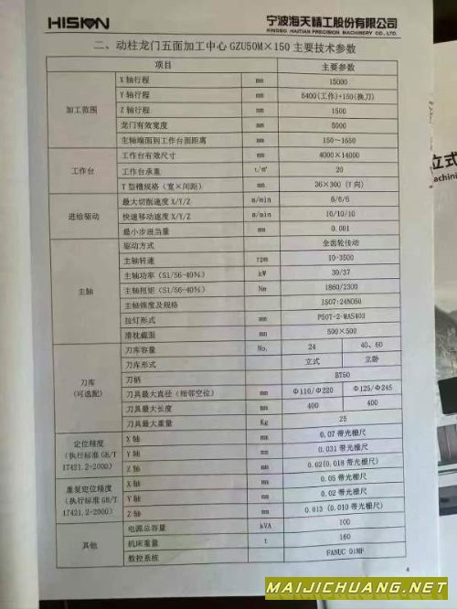马上到工期、敢付钱的老板联系我!22年到厂海天15米动柱龙门加工中心,工作台4米*14米,BT50齿轮头,三轴行程15000*5400*1500。两立柱门宽5.3米,方滑枕500*500,带自动直角头,延长头。带光栅尺 发那科系统 信息编号:S011312 |